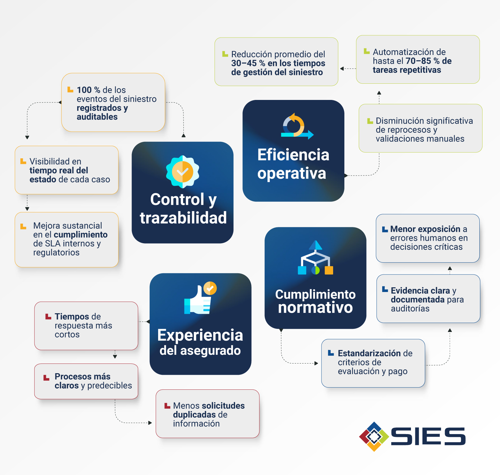 La Suite de Siniestros SIES permite a las aseguradoras pasar de una gestión reactiva a una operación controlada, trazable y escalable, alineada con las exigencias actuales del mercado.